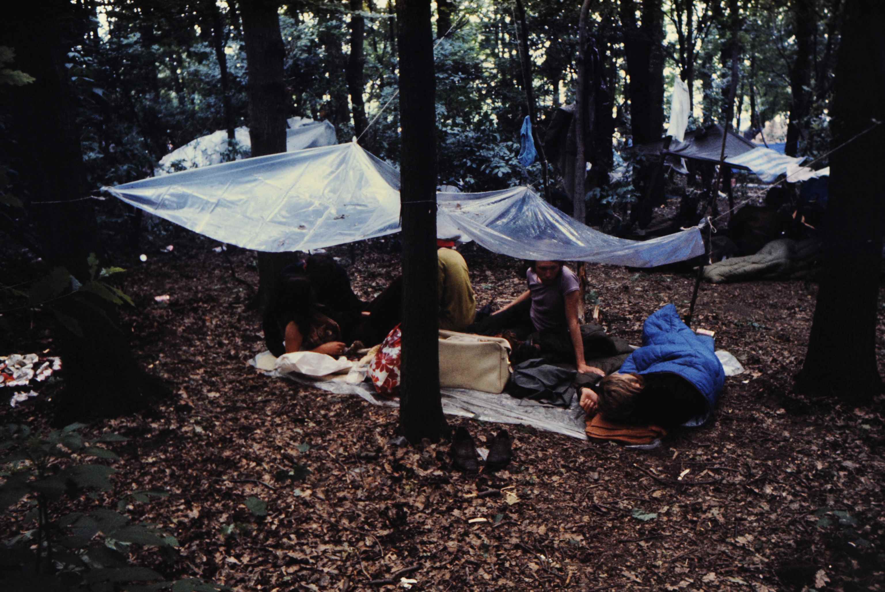 - Holland popfestival, Festival Rotterdam, Kralingse bos, bezoekers, zittende mensen, plastic zeil, bomen