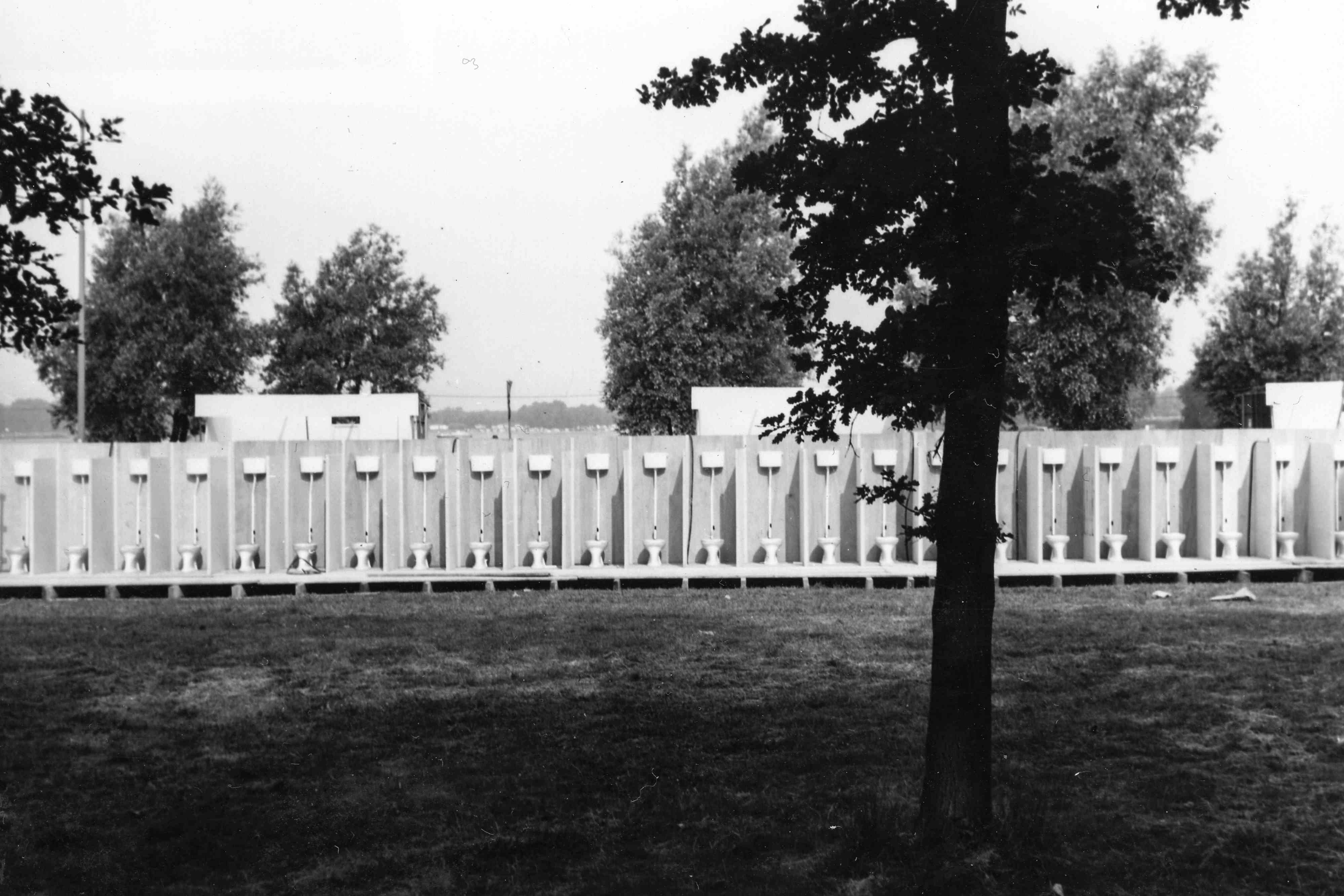 - Rij toiletten achter een boom op het veld