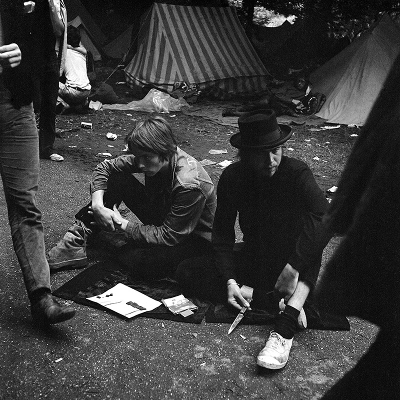 - Holland popfestival, Festival Rotterdam, Kralingse bos, zittende mannen, hoed, mes, grasveld, tent, tenten