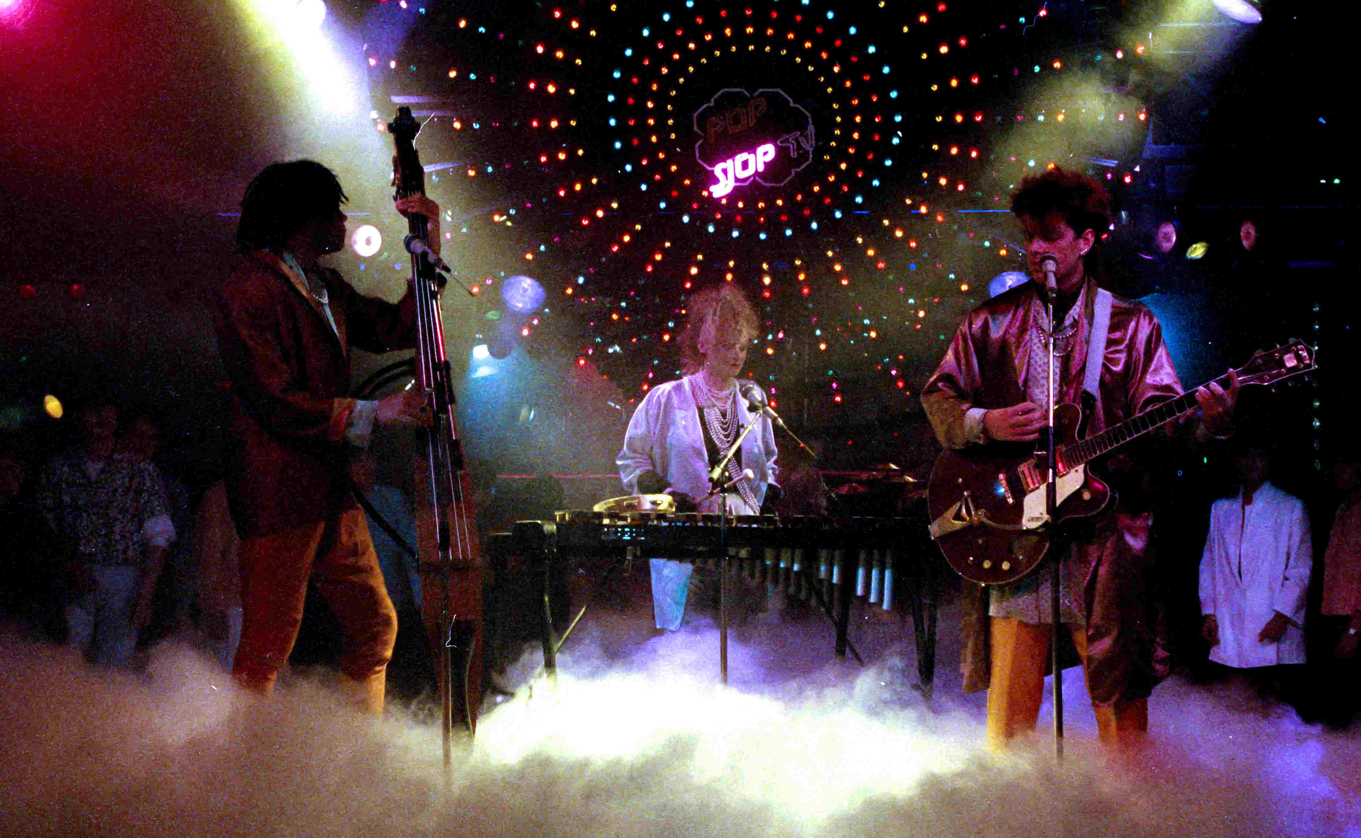 Optreden van de new wave synthesizer band Thompson Twins in Popsjop-TV, een muziekprogramma van de NCRV. Thompson Twins bestond in 1984 uit zanger Tom Bailey, toetseniste Alannah Currie en bassist Joe Leeway. Popsjop-TV werd opgenomen in diverse discotheken, waaronder ook de BlueTiek-in in Rotterdam.