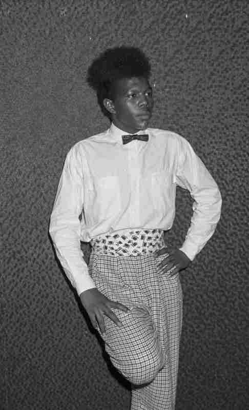 Model met vlinderstrik en cumberband. - Plaats