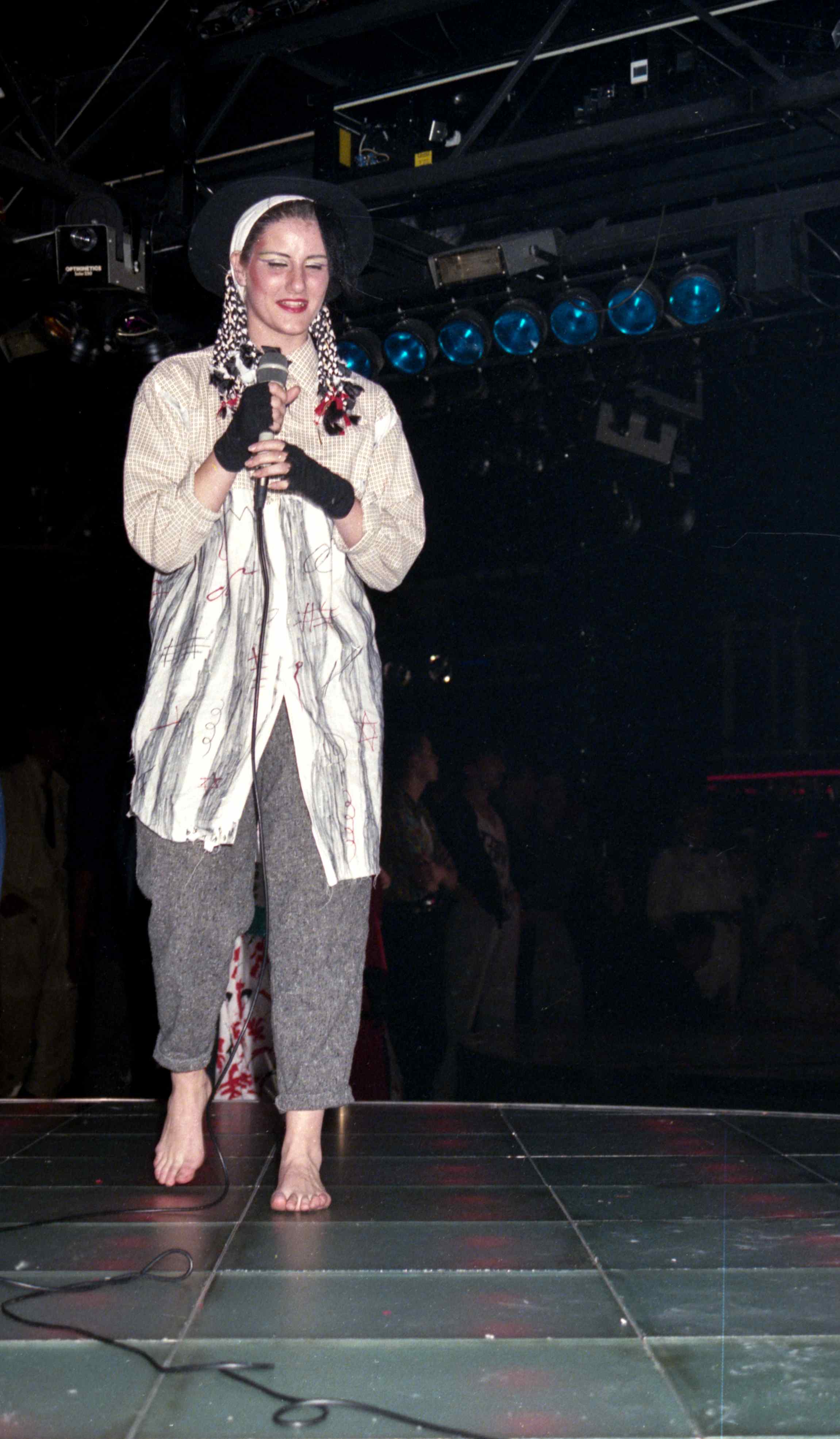 Finale van de Boy George lookalike verkiezing in de Rotterdamse discotheek BlueTiek-in. Boy George van de groep Culture Club was een opvallende persoonlijkheid met androgyn uiterlijk, extravagante kleding en uitbundige make-up.