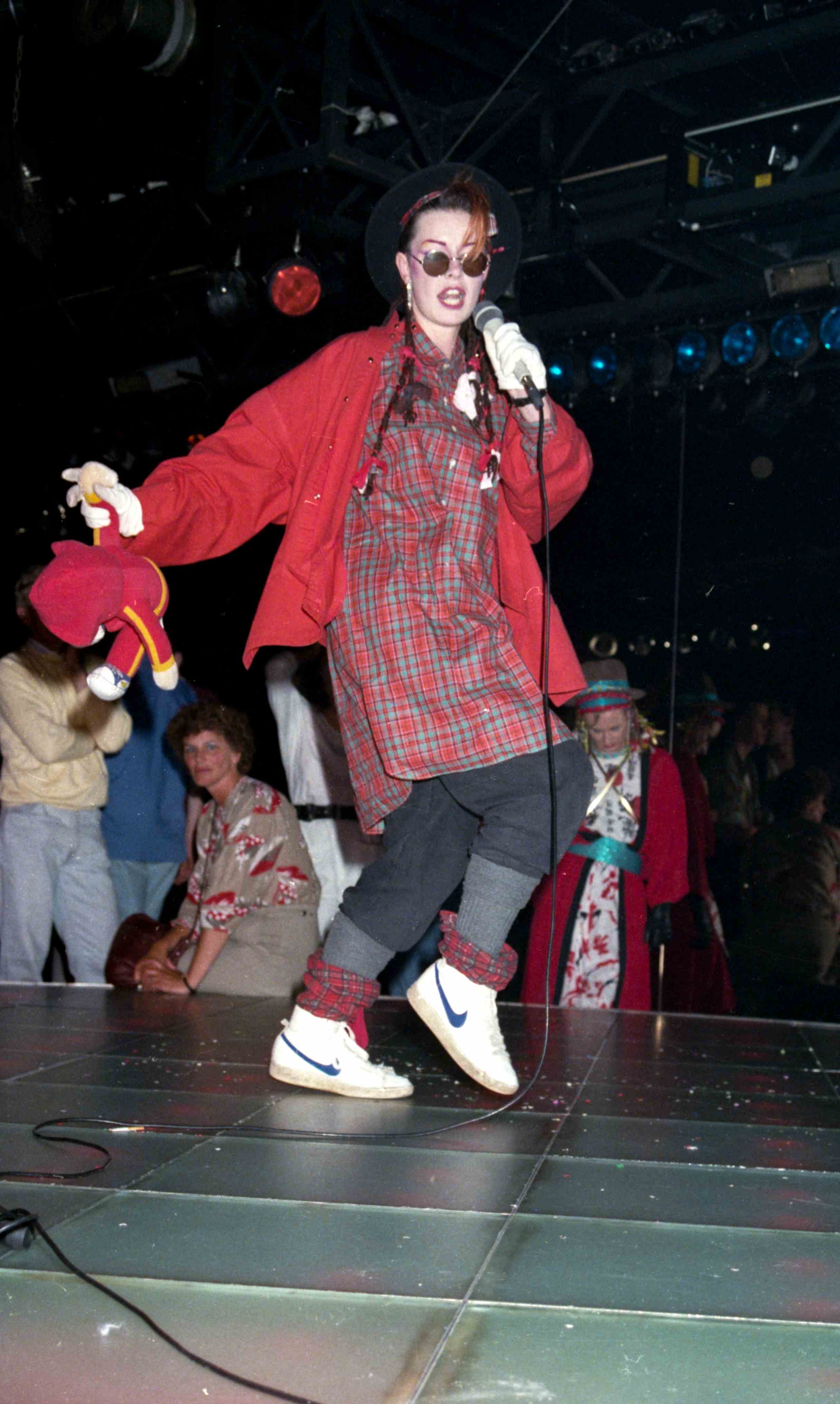 Finale van de Boy George lookalike verkiezing in de Rotterdamse discotheek BlueTiek-in. Boy George van de groep Culture Club was een opvallende persoonlijkheid met androgyn uiterlijk, extravagante kleding en uitbundige make-up.