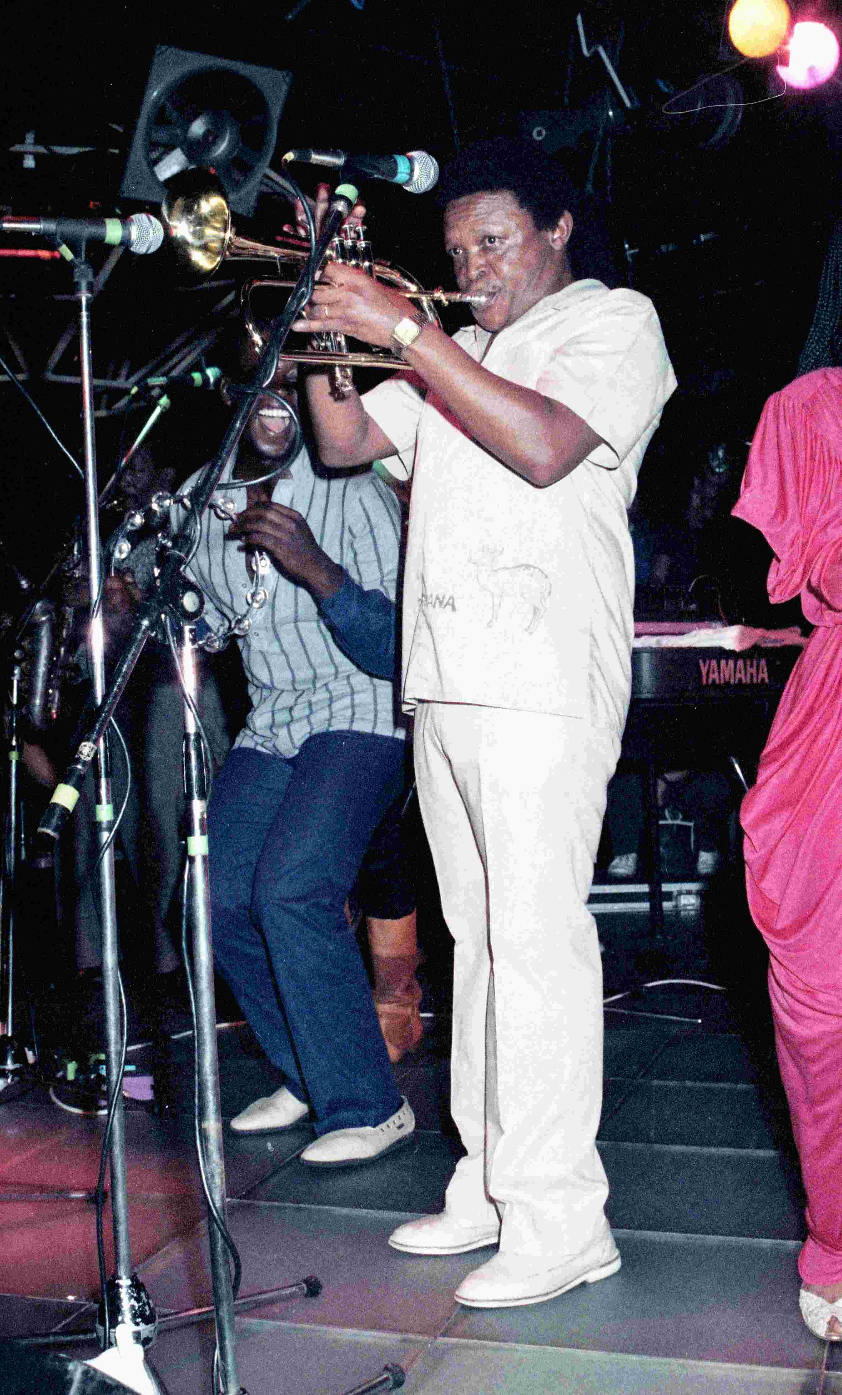 - Optreden van de Zuid-Afrikaanse trompettist en zanger Hugh Masekela (1939-2018) in de discotheek BlueTiek-in in Rotterdam, 26 juli 1984.