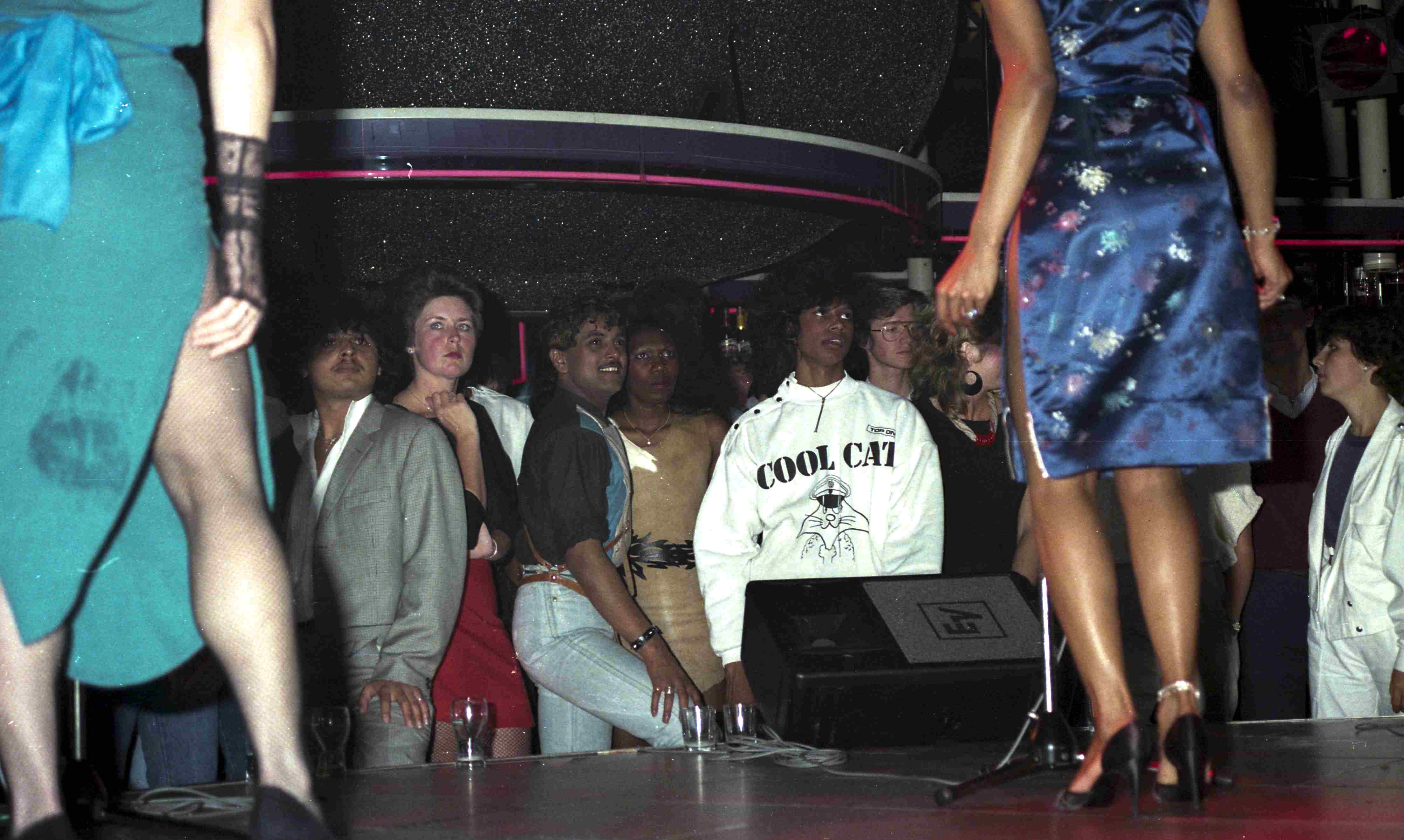 Het publiek kijkt naar het optreden van Marsha Raven en haar achtergrondzangeres. Een bezoeker draagt een trui van het merk Cool Cat.