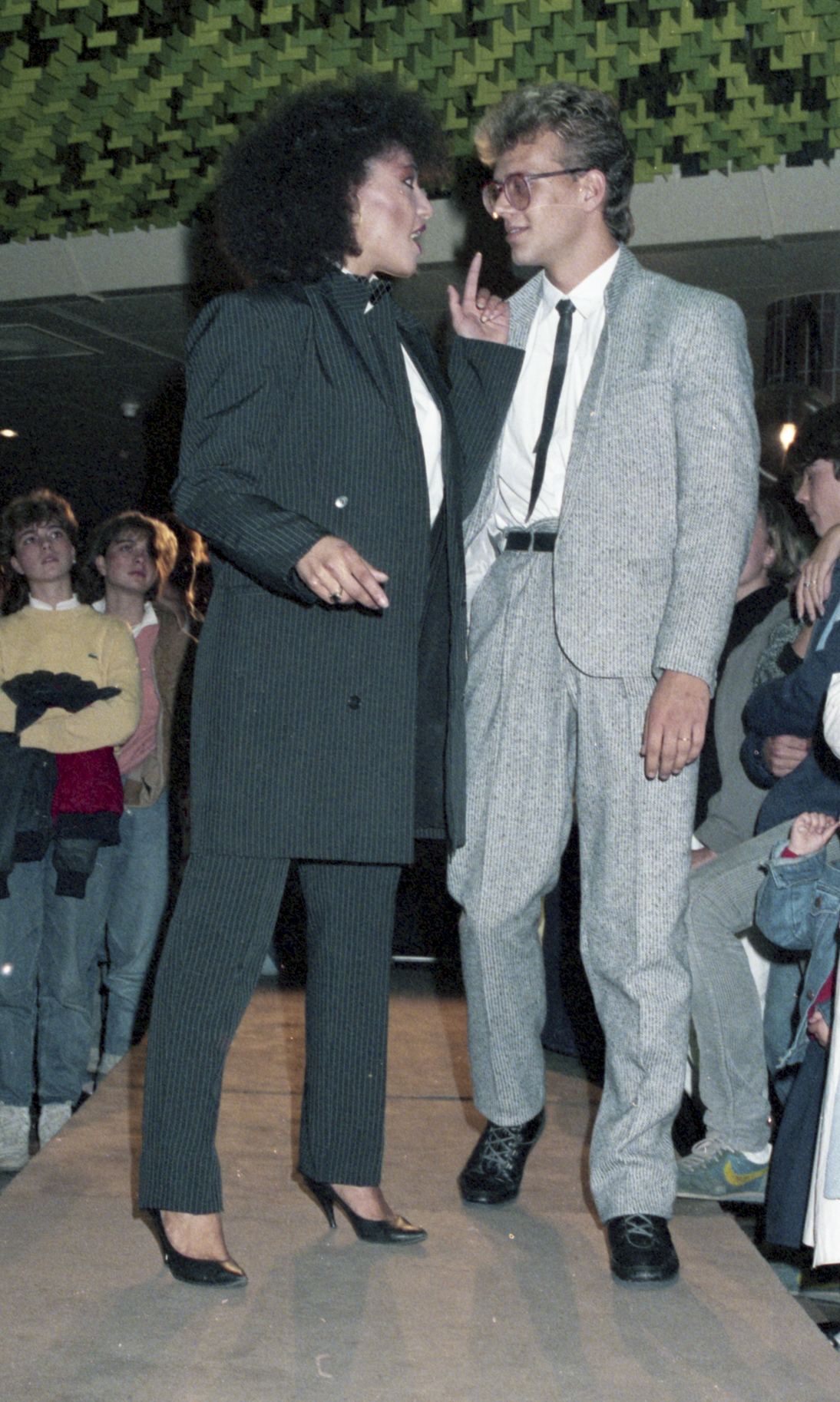 - Een modeshow voor jongeren [jong volwassenen] in een Winkelcentrum in Spijkenisse. De vrouw draagt een zakelijke outfit [power dressing] bestaande uit een pak met een lange blazer en bijpassende broek. De man draagt een pak met bandplooibroek en een kort colbertje in hetzelfde materiaal. Opvallend is zijn smalle leren stropdas.