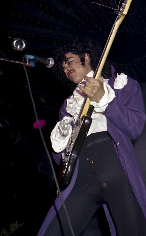 - Prince lookalike verkiezing in de discotheek BlueTiek-in. De dubbelganger draagt de karakteristieke bloes van Prince, wit met manchetten en een jabot, een nauw aansluitende broek en een lange paarse jas.