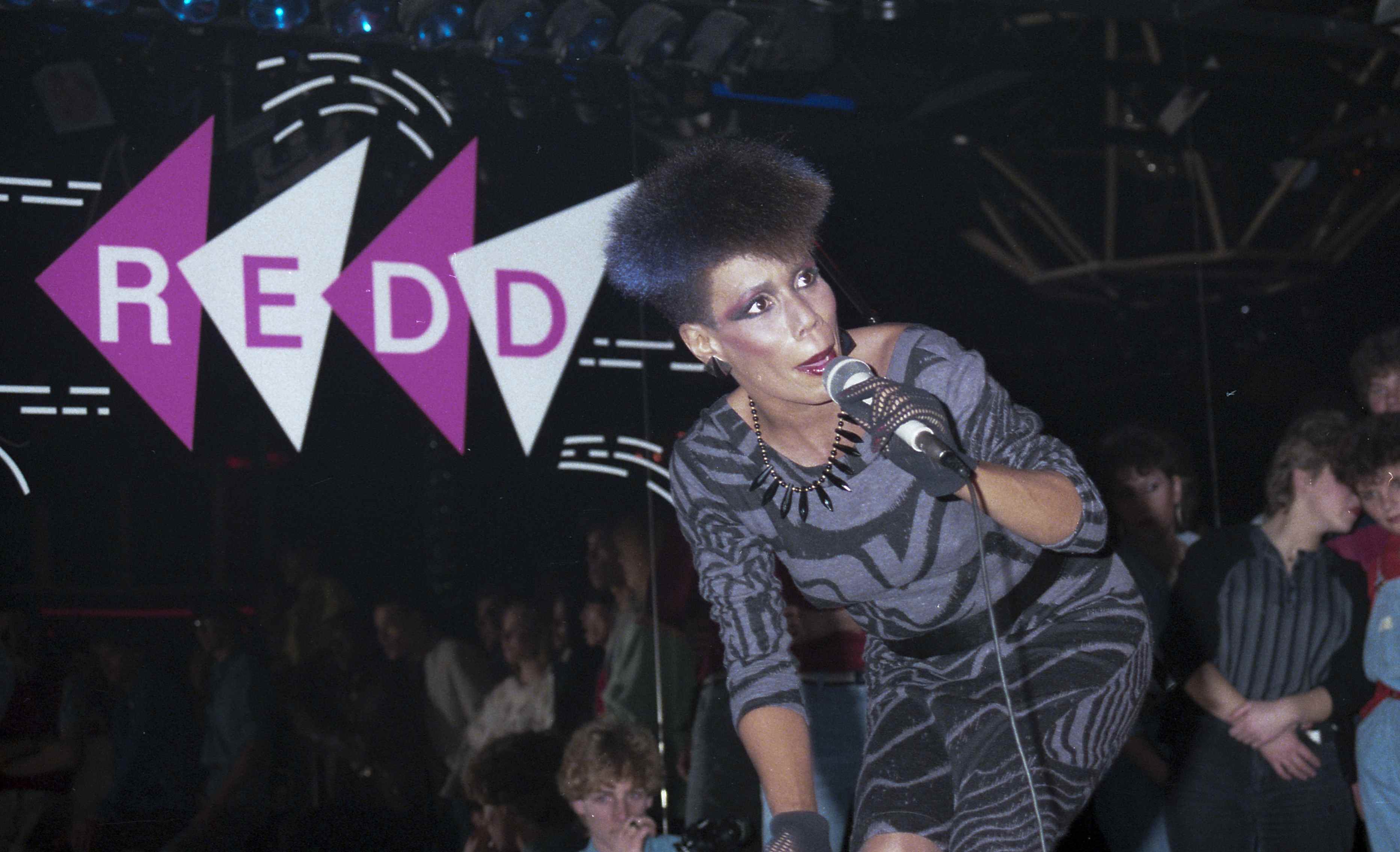 De Amerikaanse zangeres Sharon Redd treedt op in de Rotterdamse discotheek BlueTiek-in, 19 januari 1984.