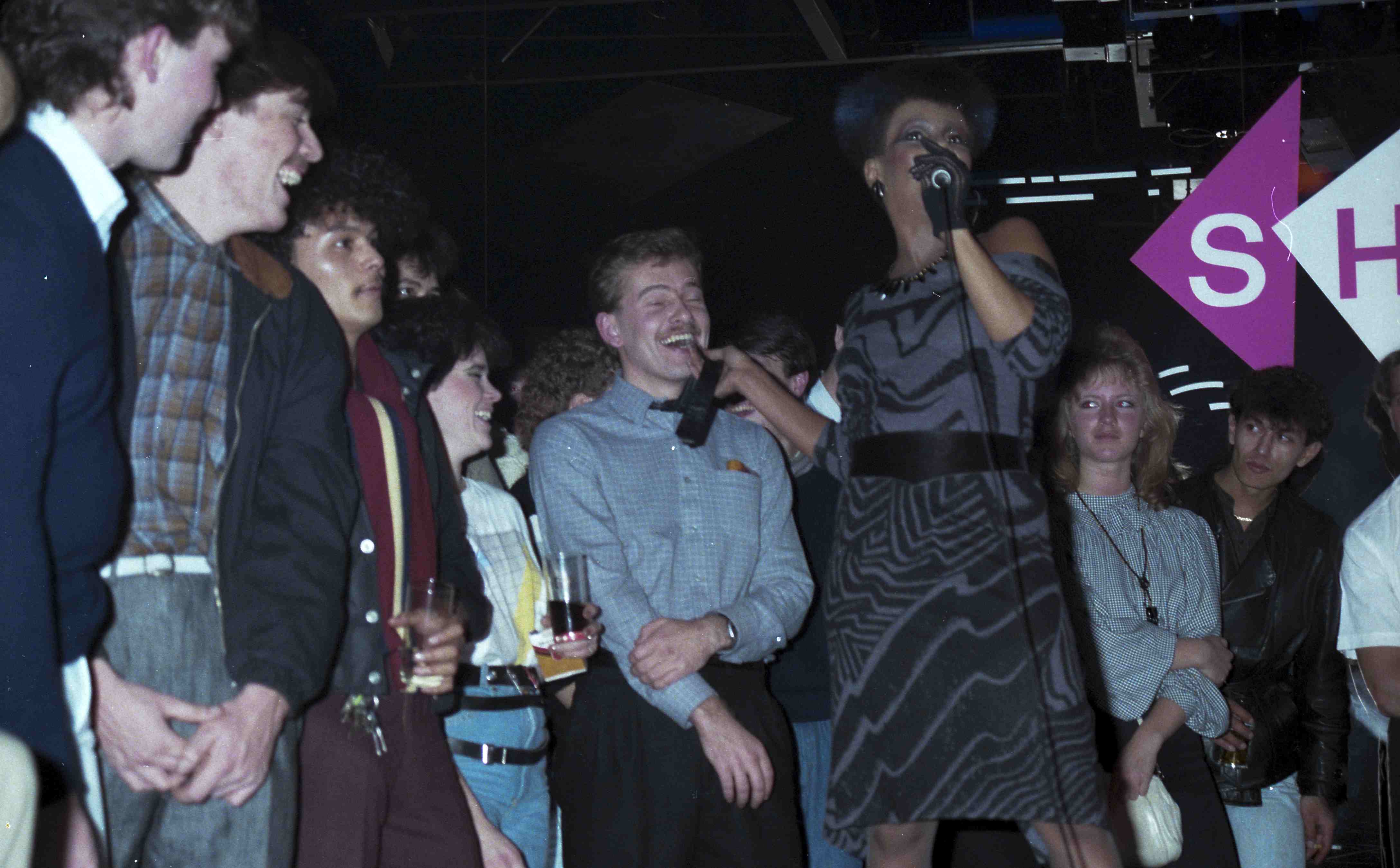 - De Amerikaanse zangeres Sharon Redd trekt plagend aan de stropdas van een jonge man in het publiek tijdens haar optreden in de Rotterdamse discotheek BlueTiek-in, 19 januari 1984