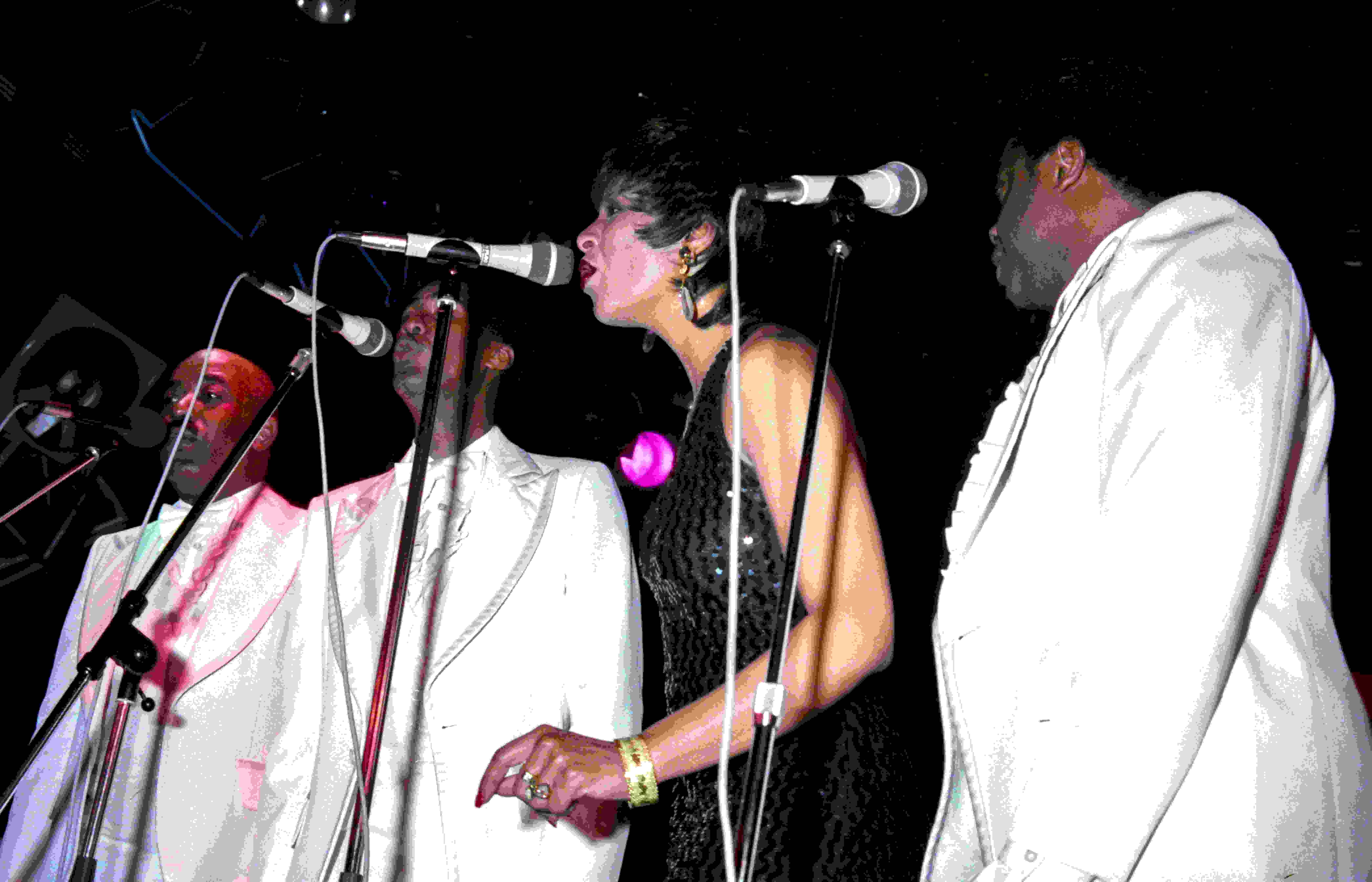 Een optreden van The Platters in de Rotterdamse discotheek BlueTiek-in. The Platters, een Amerikaanse Rythm-and-bluesgroep [RnB], bestaan sinds 1952. Ten tijde van dit optreden bestaat de band uit vier in smetteloos witte glimmende pakken gestoken zangers en een zangeres gekleed in een halterjurk van zwarte glitterstof.