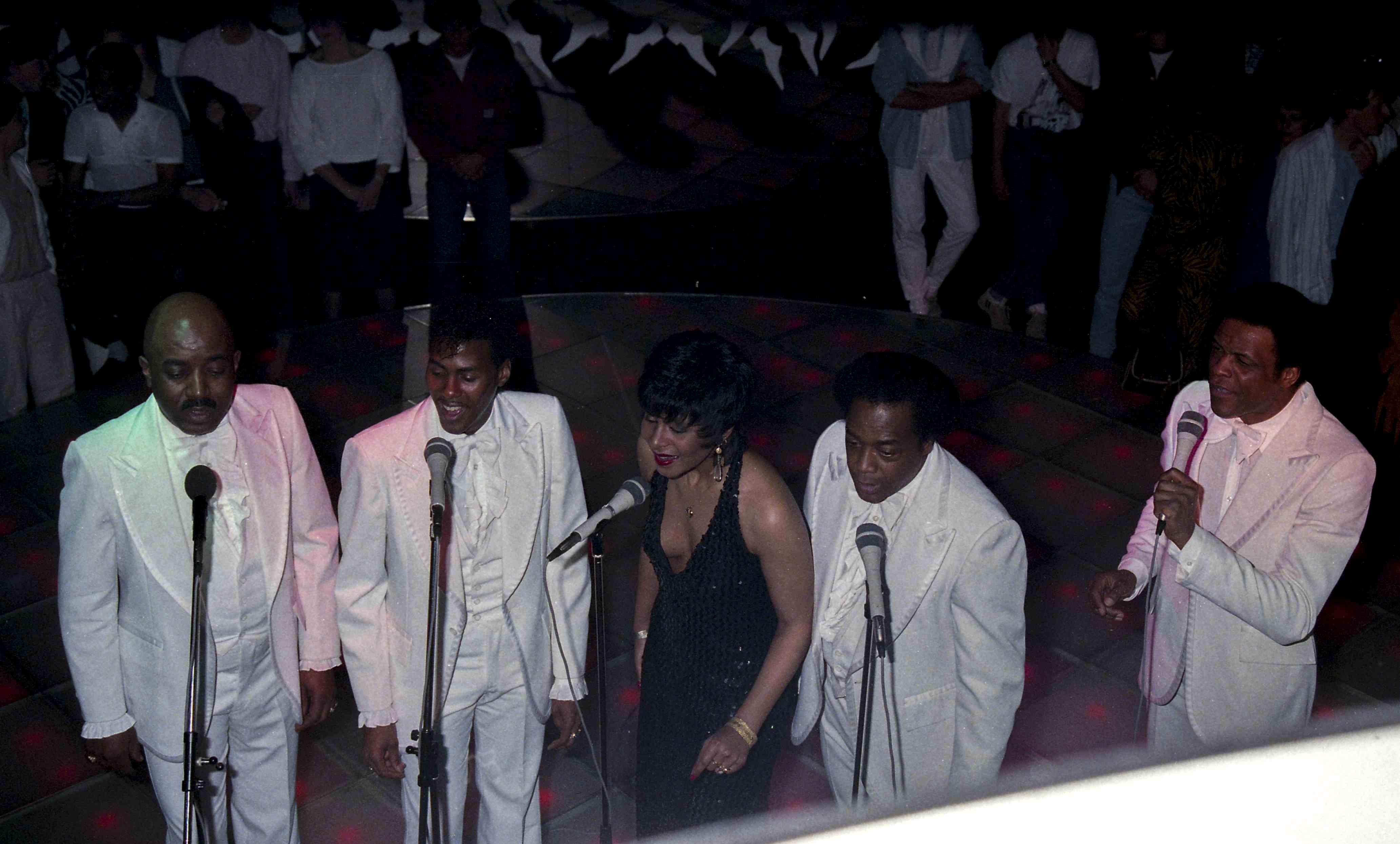 Een optreden van The Platters in de Rotterdamse discotheek BlueTiek-in. The Platters, een Amerikaanse Rythm-and-bluesgroep [RnB], bestaan sinds 1952. Ten tijde van dit optreden bestaat de band uit vier in smetteloos witte glimmende pakken gestoken zangers en een zangeres gekleed in een halterjurk van zwarte glitterstof.