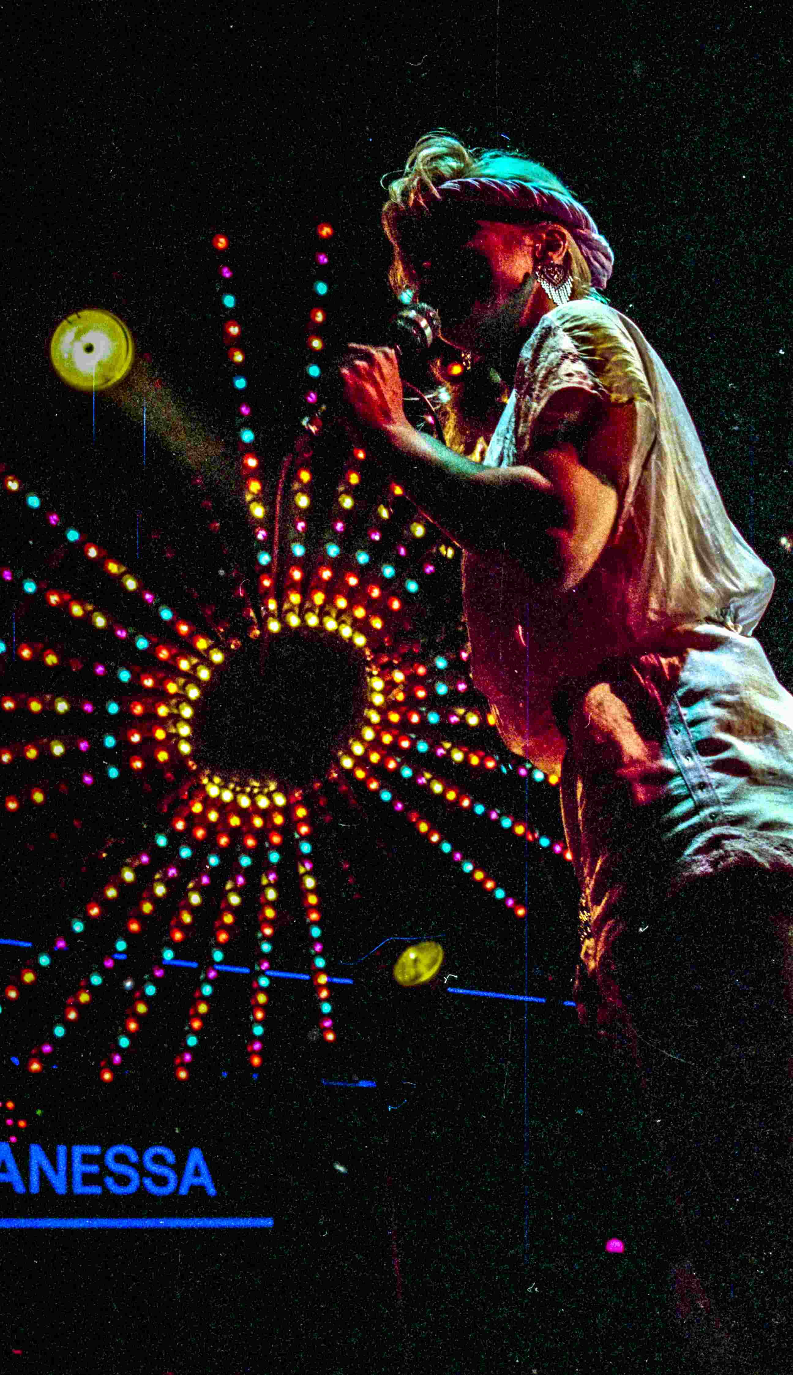 Nederlandse zangeres Vanessa treedt op in de Rotterdamse discotheek BlueTiek-in. Zij valt in omdat de Amerikaanse zangeres Eartha Kitt in Duitsland ziek is geworden. Vanessa draagt een jumpsuit met korte pijpen. In haar 'big hair' draagt zij over haar voorhoofd een gedraaide sjaal, 5 juli 1984.