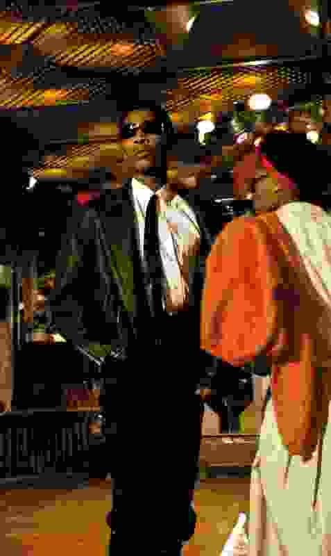 Outfit met overhemd met smalle stropdas gebaseerd op het klassieke herenkostuum en dame in Afrikaanse beïnvloede kleding.