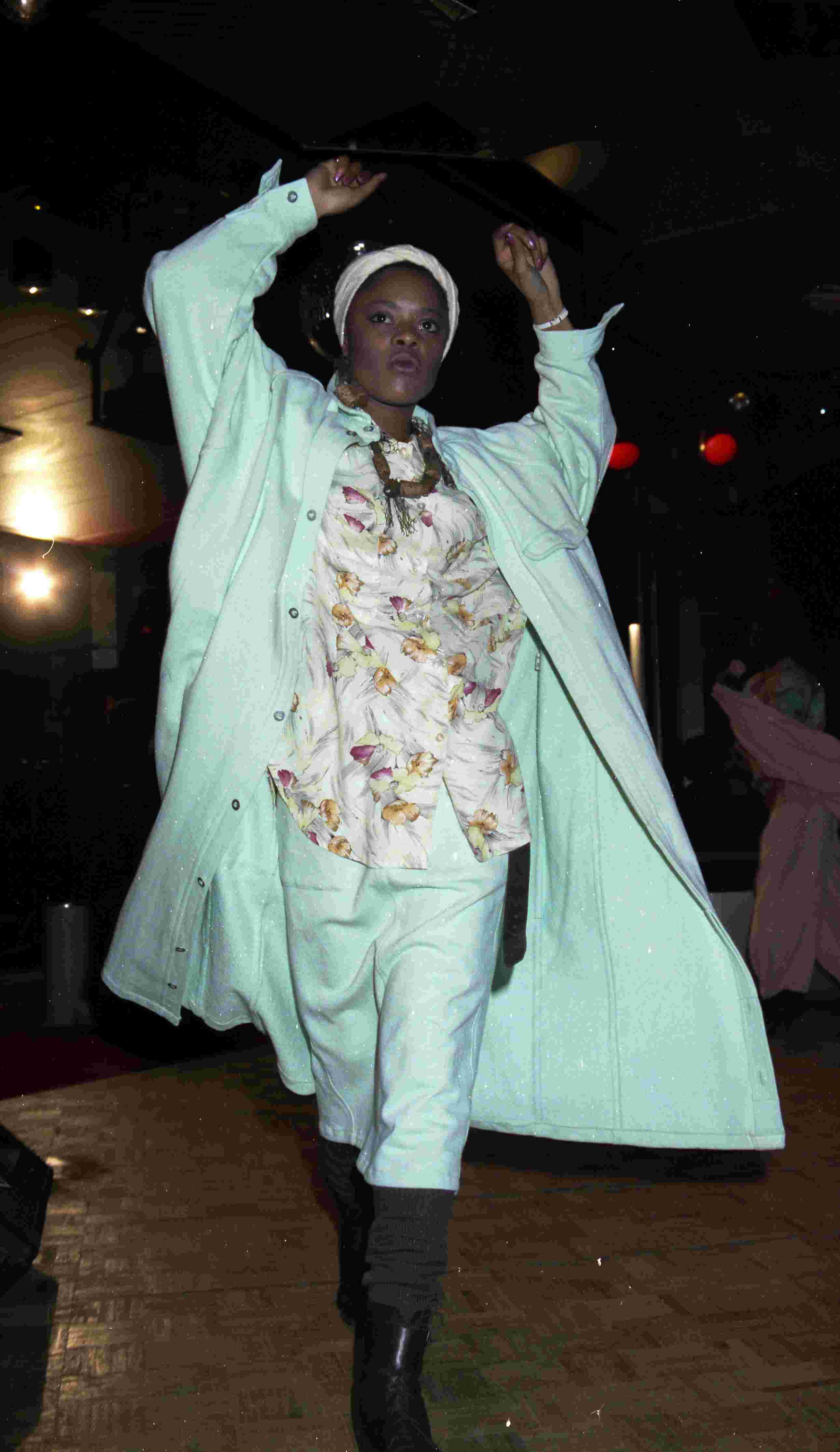 - Modeshow van de kledingwinkels BlueTiek-in in het Hilton Hotel. Oversized raincoat in mintgroen en kleding met Afrikaanse invloeden.