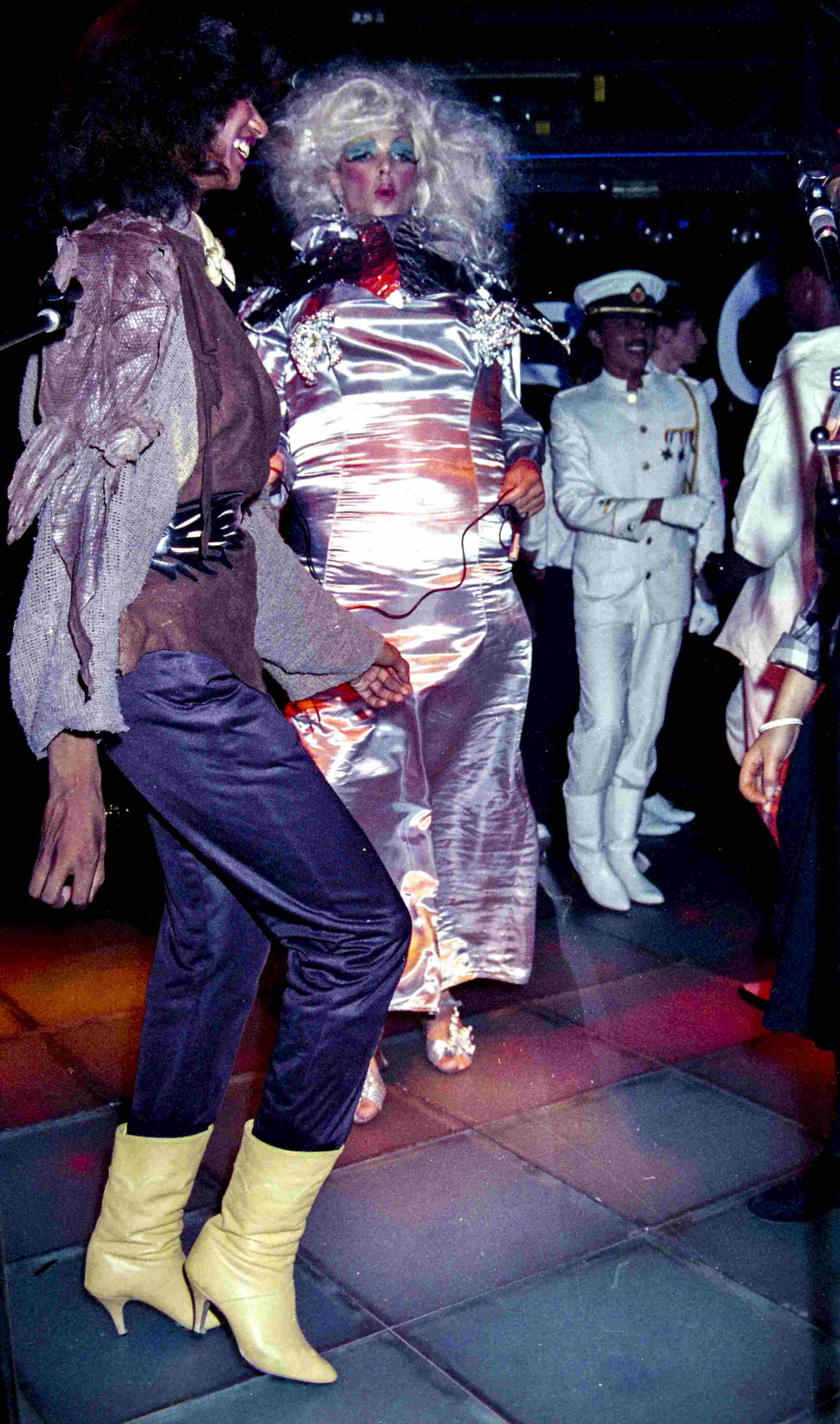 Zilversatijnen witte outfit gebaseerd op Mae West. - Plaats