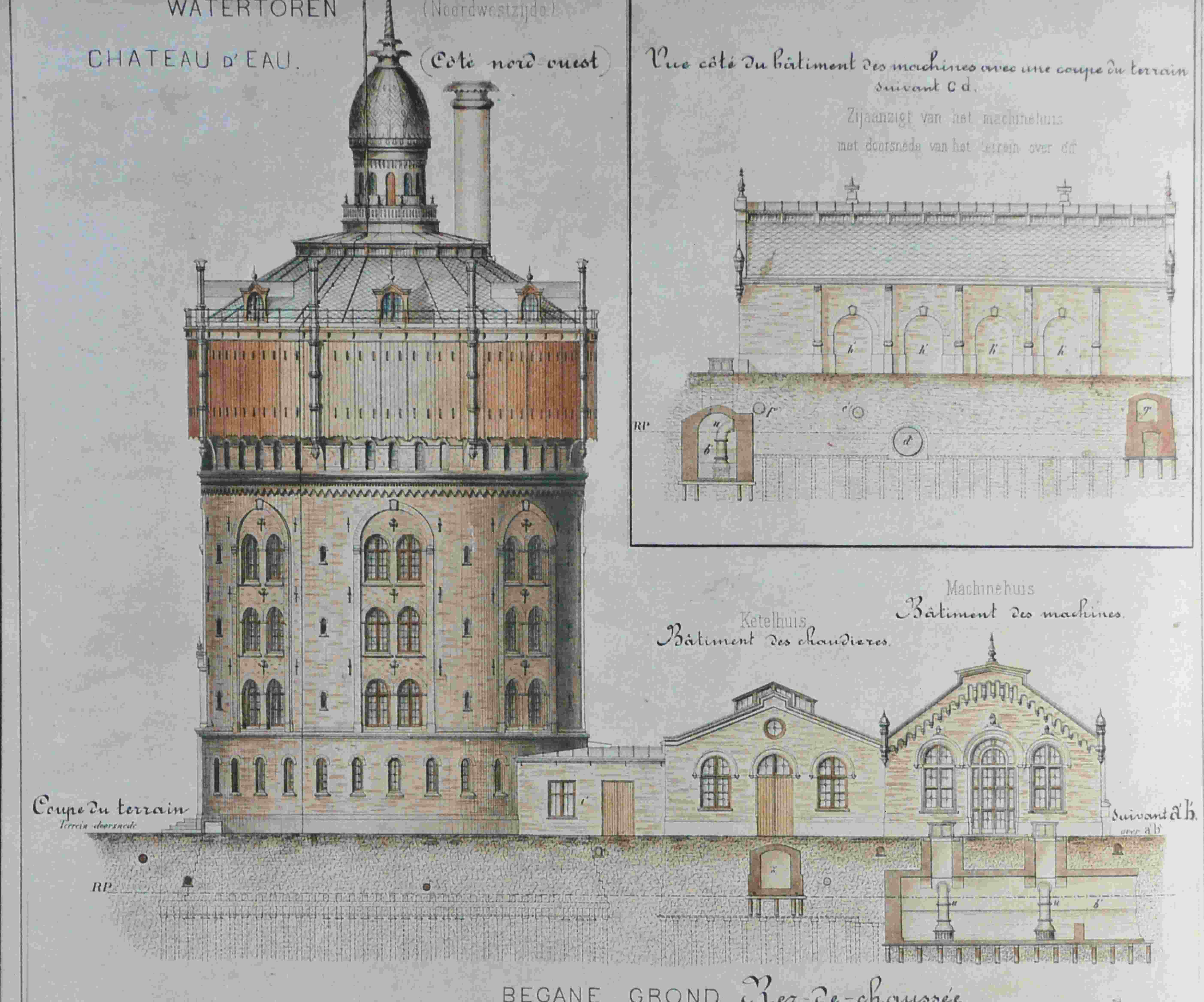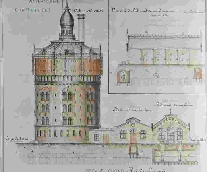 - Tekening van de watertoren met daarnaast de hallen 0, 1 en 2.