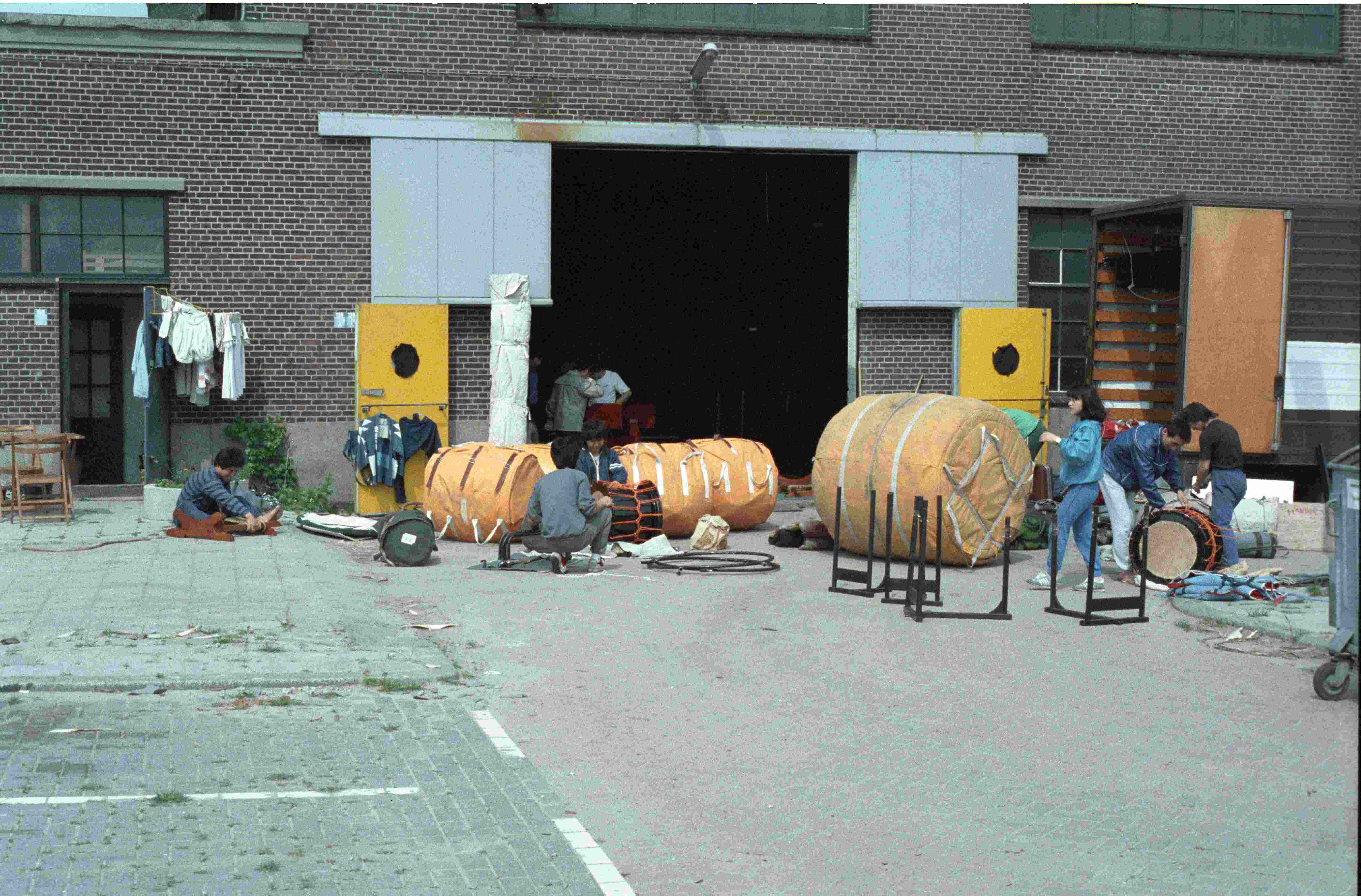 - De Japanse trommelaars van Kodo bereiden zich buiten Hal 4 voor op hun optreden op 24mei 1988.