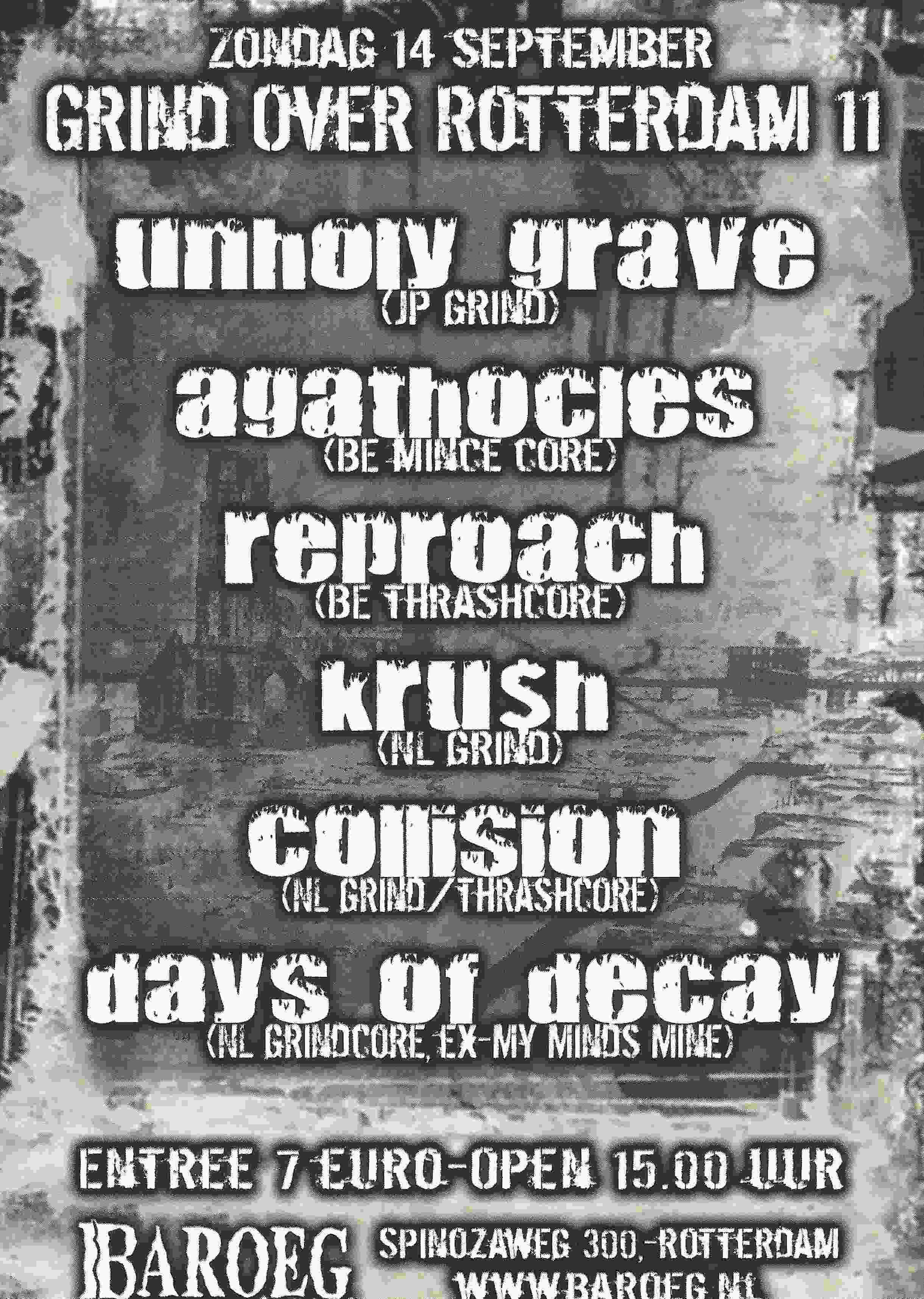 links met info:over Grind over Rotterdam 11https://www.podiuminfo.nl/concert/34992/Grind-Over-Rotterdam-11/Baroeg/https://www.last.fm/event/657156+Grind+over+Rotterdam+11"Tijdschema:15.00: Deur Open15.30-15.55 Obtuse16.15-16.45 Collision17.05-17.40 Kru$h18.00-18.35 Reproach18.55-19.40 Agathocles20.00-20.45 Unholy Grave "(bron: https://www.last.fm/event/657156+Grind+over+Rotterdam+11)hier staan ook links naar de bands bij met afspeellijstenblijkbaar speelde days of decay niet maar in de plaats daarvan wel de band obtuse?