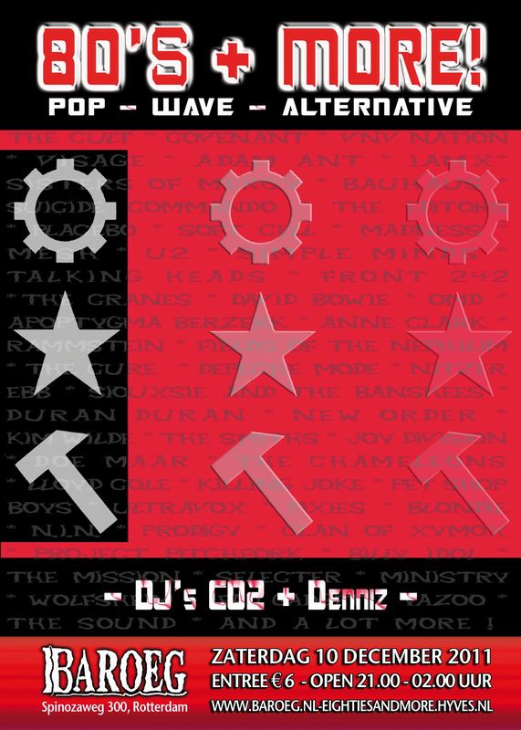 Rood vlak met 3 tandwielen, 3 sterren, 3 hamers en diverse 80s artiesten en bands.