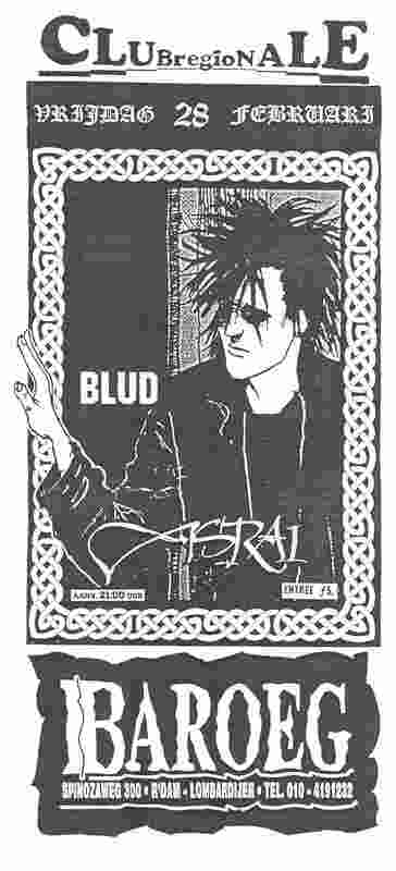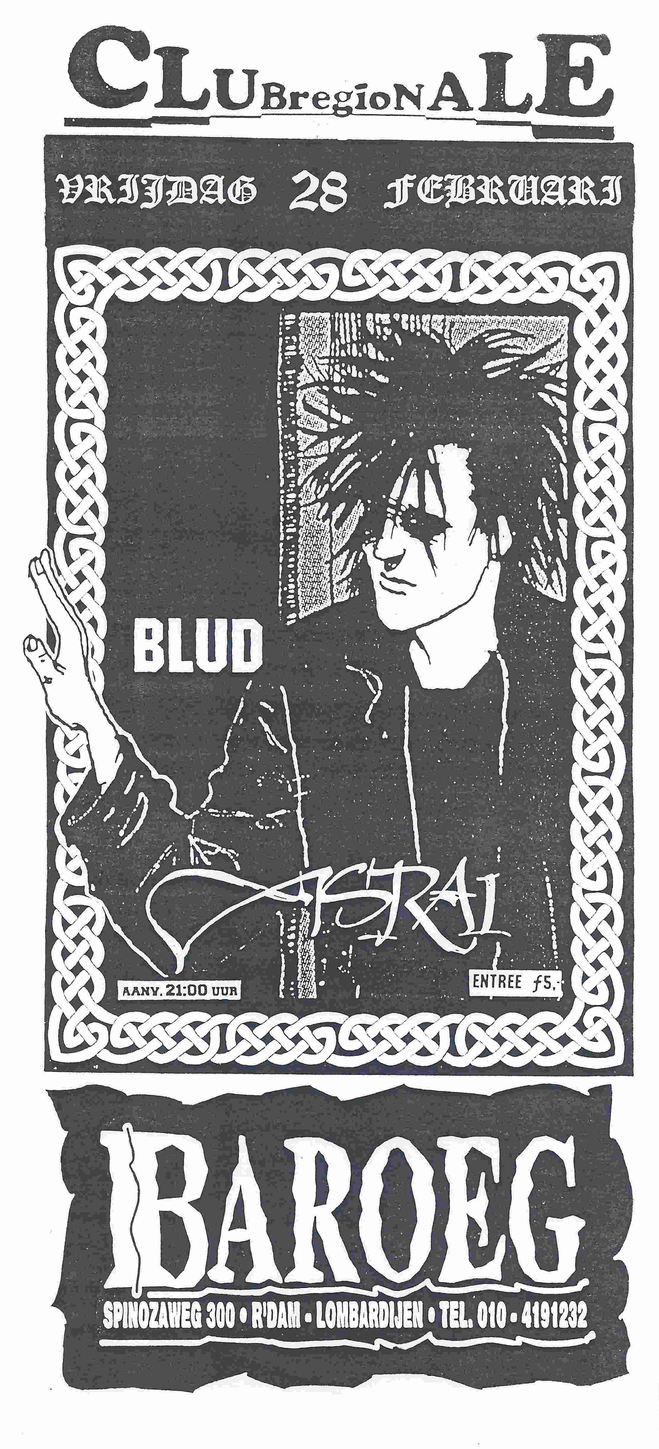 Zwart witte flyer met bovenaan Club Regionale in zwarte letters met groot naar klein naar groot verloop. Daaronder een zwart randje met in keltische letters Vrijdag 28 Februari. Daaronder een keltisch vlechrandje met een tekening van een punker met de hand die over het vlechtrandje heen is getekend. Er staat BLUD in geschreven in witte letters. en daaronder Asraï. Aanv 21:00 Entree F5,-