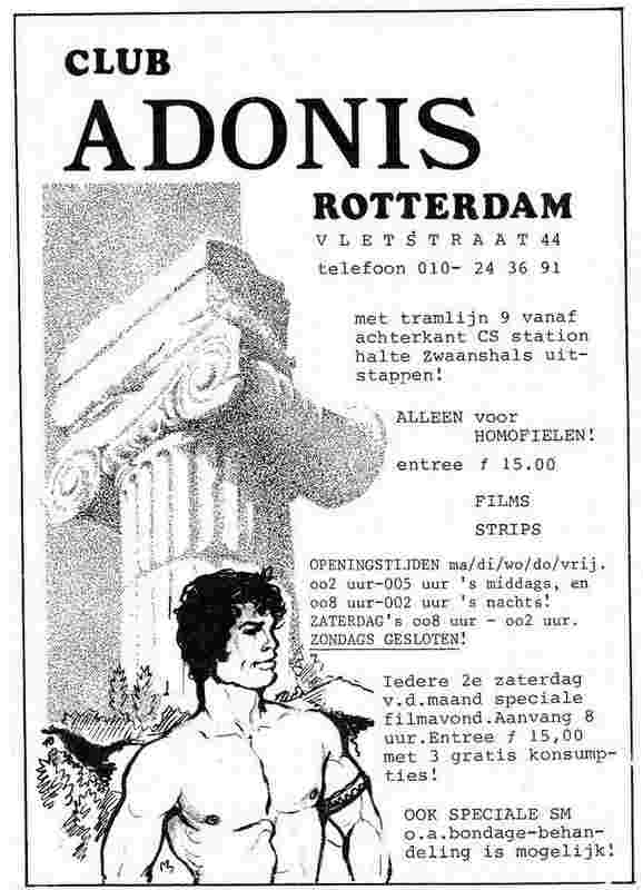 - Adonis was een club aan de Vletstraat 44 alleen voor homofielen! Speciale bondage behandeling mogelijk.