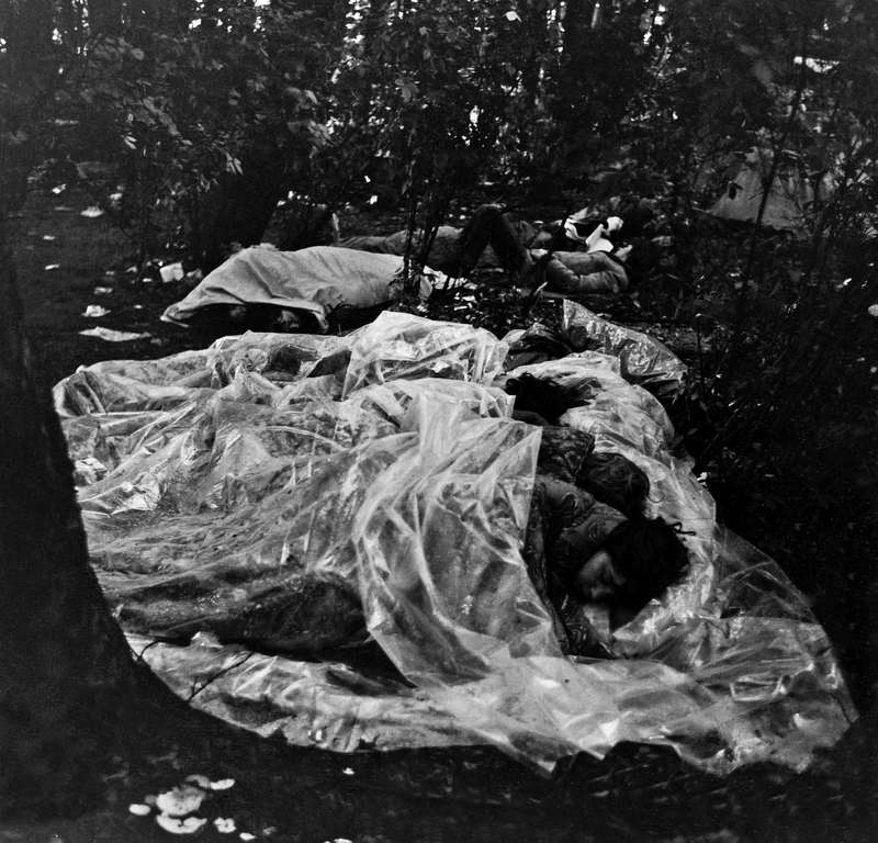 - Bezoekers liggen onder een zeiltje tijdens een regenachtige dag bij het Holland Pop Festival