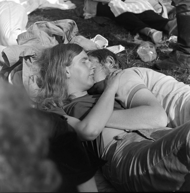 - Close-up van een op de grond liggend stel tijdens het Holland Pop Festival